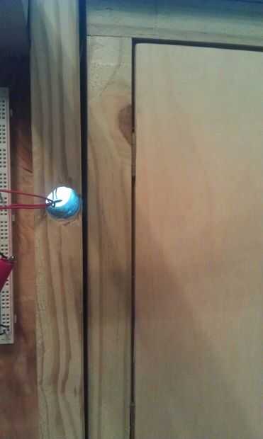 Taladrar un agujero en el marco de la puerta. El agujero es para pasar los cables por conectar el Sensor de impacto de sonido con la tarea y protoboard. Puede utilizar un tamaño de agujero más pequeño si quieres, sólo usamos este tamaño porque es lo que teníamos que trabajar con.