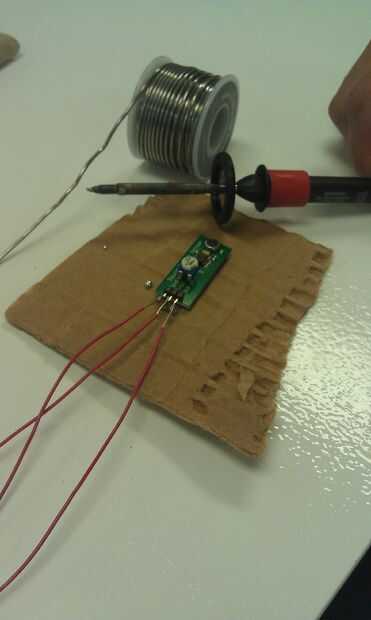 Necesita soldar el las puntas del Sensor de sonido para tres cables diferentes. Estos son los cables que pasen a través del agujero en el marco. Sin soldar el sensor tendría que fijarse en el tablero de tareas.