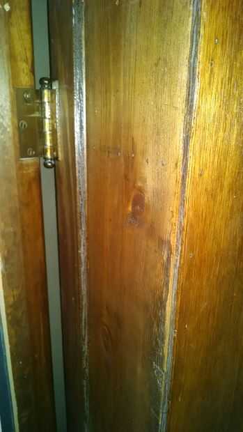 I tomó un pedazo de madera contrachapada de 3/4 de pulgada y pegado y clavado en el lado de las bisagras como soporte para las bisagras. Utilicé las bisagras originales ya que sentí que eran suficientemente fuertes como su pasado un año y no cedió el estante
