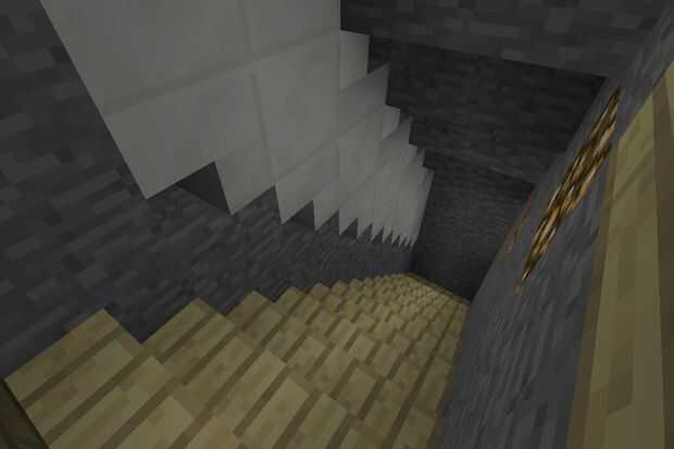 Ahora ir a sus escaleras. Coloque una escalera al revés (Asegúrese de que todavía se puede ver la puerta), Repetir este proceso todo el camino hasta las escaleras excepto con la puerta en su lugar uso roble tablones de madera