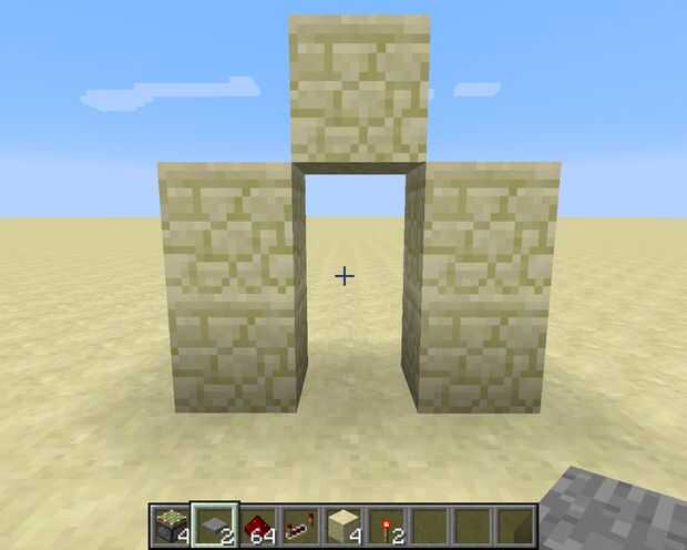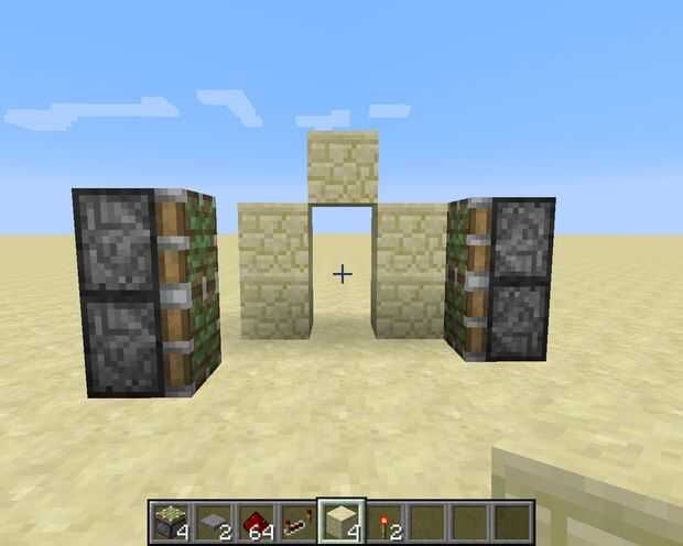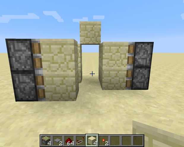 En primer lugar, coloque 5 bloques de arenisca formando un arco como se muestra en la foto de arriba. Luego coloque 2 pistones pegajosos encima de la otra mirando a la izquierda. A continuación, mueva hacia atrás un espacio y Coloque 2 pistones pegajosos más, pero esta vez hacia la derecha. Ahora le agregue 2 arenisca frente a ellos.