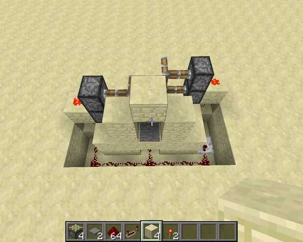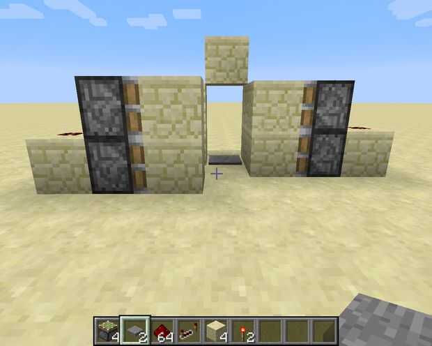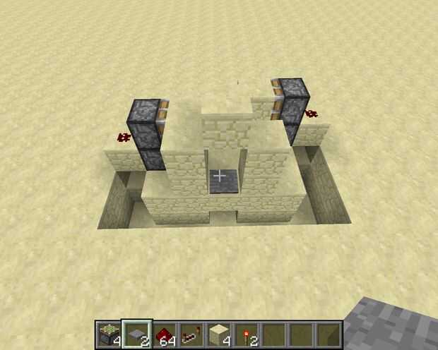 Ahora agregue un bloque de piedra arenisca detrás de los pistones de la menor y coloque polvo de redstone encima de ellos. Luego en medio de su arco se coloque una placa de presión. Ahora frente a su plato de presión, excavar dos espacios y luego tres a la izquierda y tres a la derecha. En el lado izquierdo que cavó, ahora debe cavar uno más adelante y a la derecha cavar dos más adelante como se muestra arriba. En los bloques con redstone en ellos debe cavar una cuadra directamente bajo y deje una cuadra debajo de eso. Ahora coloque las antorchas de redstone en medio de esos dos bloques. También, cavar una cuadra directamente bajo el bloque de la placa de presión. A continuación, alambre redstone por debajo de la placa de presión a ambos bloques con las antorchas de redstone sobre ellos y a la derecha, poner un repetidor de redstone en el segundo bloque va hacia la antorcha. (el repetidor debe establecerse en tres garrapatas, que significa a la derecha haga clic tres veces) Ambos pistones se deberían potencia ahora.