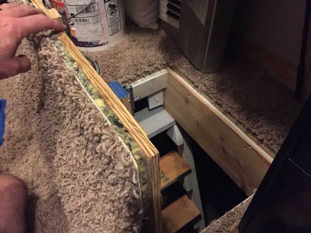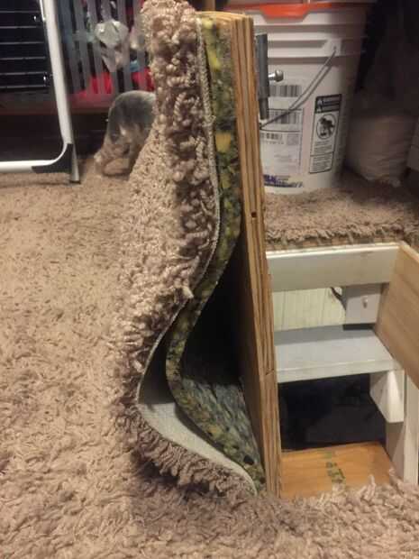 2) el acolchado y la alfombra necesitan fijarse a la puerta secreta. Sólo Aplique cinta de la alfombra al lado de la puerta opuesto a la bisagra. Esto permitirá que la alfombra y el relleno a la flexión cuando se abre la puerta. Ya que tire de la alfombra para abrir la puerta secreta, que decidí también utilice tornillos para madera cada 4 pulgadas para fijar la alfombra a este lado de la puerta. No no tornillo en demasiado, que no desean aspirar la alfombra hacia abajo y dejar una sangría visible.
