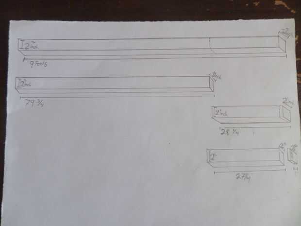 Corte surgidas 9 pies vigas en pieza individual que mesure 79 3/4 pulgadas y 28 1/4 pulgadas, cortadas el 28 1/4 de pulgada a 27 1/4 de pulgada pieza dejando 1 pulgada.