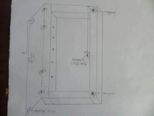 Taladro 2 agujeros grande enogh para los imanes se encajan en el borde de la viga oposide al que con el hings y pegan. Plase la magnéticas captura cierre en el lado de las de 2 por 2 por 4 piezas de madera y pegamento o tornillos juntos. Pegar el metal platea a la hoja de madera en los bordes y en el centro por lo que cuando se cierra la hoja de la platea metal hacen contacto con el pasador de retén y los imanes.