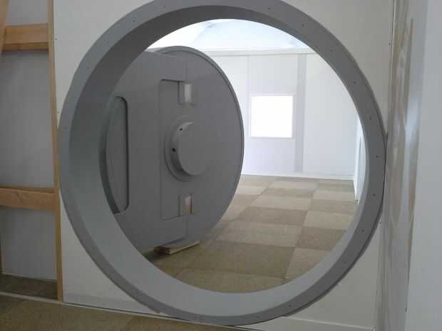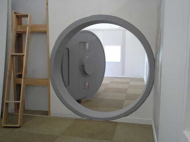 atornilla la puerta en nuestras estructuras de madera de la exposición en un ángulo para que los visitantes podrían ver la puerta y saber tuvieron que caminar a través de la abertura para llegar a la siguiente parte de la exposición.