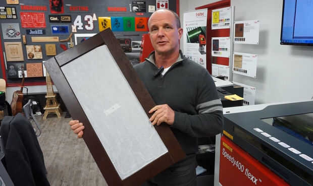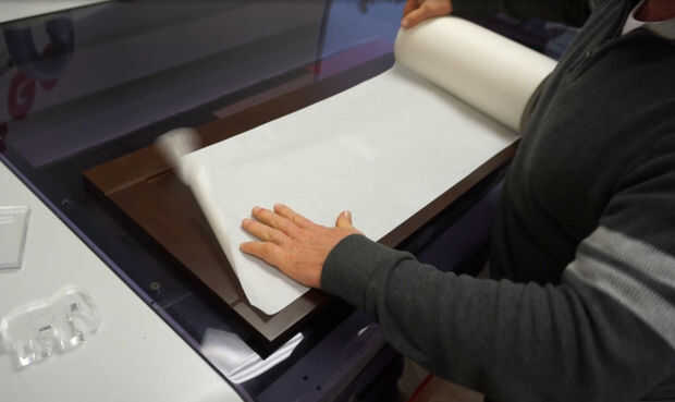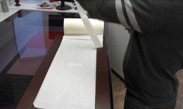 Ponemos la máscara de transferencia en el prevenir cualquier coloración o cualquier lado ardiente podría suceder cuando estamos láser cortando la pieza.