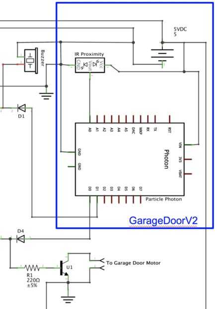 El sistema principal está conformado por las partes en azul en el diagrama. El fotón y el Sensor de proximidad de infrarrojos. El sensor de proximidad recibe alimentación (5 v y tierra) y su salida de la señal analógica va al pin A0 en el fotón. La salida D0 del fotón se utiliza para simular una pulsación para su motor de puerta de garaje. Se conecta a la base del transistor NPN a través de una resistencia de ~ 200 ohm. El emisor está ligado a la tierra junto con un contacto de los contactos de actuador de puerta de garaje. El colector está conectado a otro contacto de actuador de puerta de garaje e izquierda flotar hasta D0 va alta y conduce el transistor en de 800ms tirando el colector a tierra que simula una prensa del botón en la puerta de garaje.