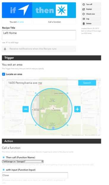 2. otra receta que me gusta usar es utilizando la Geocerca de IOS para accionar la puerta para abrir o cerrar. Referencia se muestra una foto de mi receta (bueno, con una dirección diferente). Necesita una para salir de su casa y probablemente otro para llegar casa. Una sugerencia es establecer la Geocerca dejando que un círculo más pequeño de la llegada para evitar problemas cuando el perro cerca de su casa y la puerta de subir y bajar un montón :-)