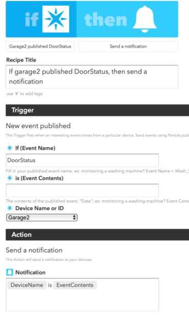 1. el más importante receta creada es la que publica las notificaciones de IOS (o Android), por lo que se puede ver cuando la puerta cambia de abierto a cerrado o cerrado a abierto. Llamé por receta IFTTT "DoorStatus" y se puede ver captura de pantalla para la configuración de la receta.