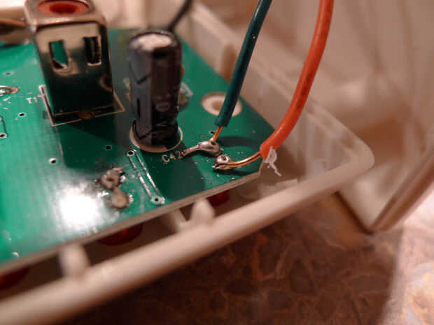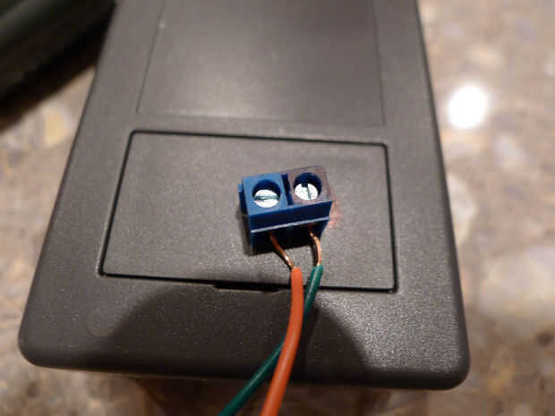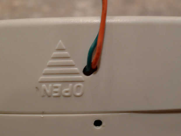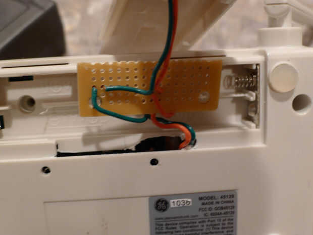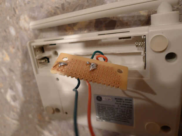 Paso 3. Usé una dremel para algunos del plástico en la tapa de la batería por lo que podían salir los cables de lo PCB en el área de la batería. Esto es donde también adjunta un (superficial tal vez) tablero para conectar más cables que llevaría finalmente a los terminales de tornillo conectado al arduino. La idea de la Junta era asegurarse de que había holgura en el sistema, así que los cables no conseguir apretamientos, estiramientos de la soldadura delicada en los pines del LED en la placa de la estación base de alarma.