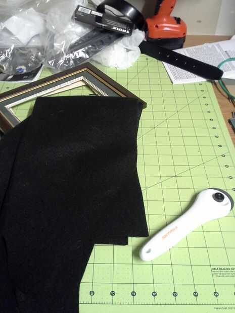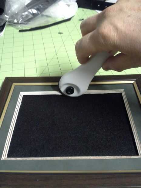 Luego usé un cuchillo de la caja para cortar un agujero en una de las partes posterioras. El otro tenía estera agradable que funcionaría bien. Para cubrir las espaldas de los marcos cuando miró por el agujero he utilizado pegamento caliente y fieltro negro. Luego cortar el fieltro fuera del centro con el mate como guía.