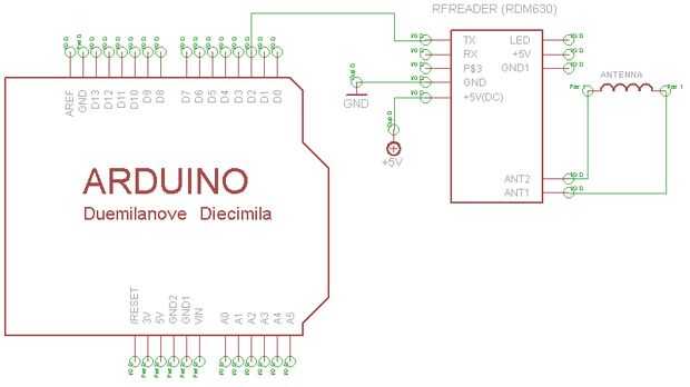 Este proyecto consta de varios "módulos" que usted necesita para conectar el Arduino y probar de antemano. Primer gancho-para arriba el lector del RF. Puede utilizar la salida de 5v de Arduino para alimentación y un puerto digital (yo usé 2) para obtener la señal. La RDM630 que también tiene pins para un led que no utilizo. También tiene un pin RX para enviar información hacia el lector del RF, pero no uso sea. Su antena, haz una etiqueta y usar el serial monitor de Arduino para ver si se detecta. Ahora también puede comenzar a trabajar en la mejora de la antena al tratar de agregar o quitar vueltas, intentando diversas formas etcétera. Fuente de alimentación la Adruino con la alimentación de 9v, no sólo USB porque al menos en mi caso que no funcionaba. Usted puede descargar el archivo llamado 'rfid3.pde' para probar. El código requiere NewSoftSerial.h que puede obtenerse aquí