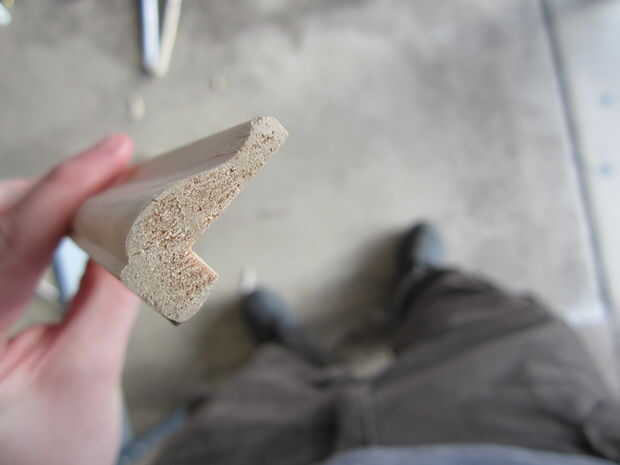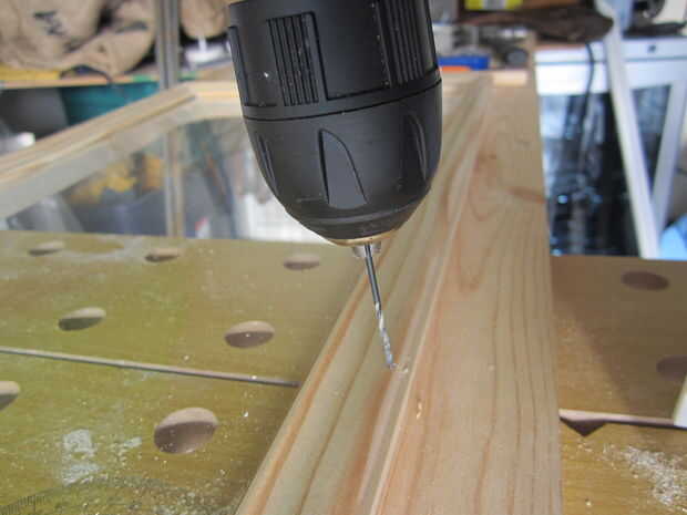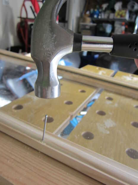 Puesto que estaba trabajando tan cerca de vidrio y el moldeo es muy delgado, yo los agujeros perforados antes de empezar a martillazos en los clavos. Esto evita la madera partida y le impide que necesitan golpear los clavos como duro. Asegúrese de perforar agujeros más pequeños que el ancho de la uña.