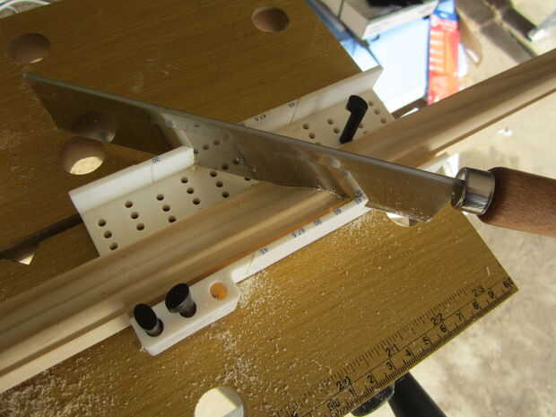 Mida la longitud de la moldura a lo largo del vidrio y utilizar una caja de ingletes y corte ángulos de 45 grados (Asegúrese de compensar la longitud extra necesaria en el corte en ángulo). Montar las piezas en el panel y asegúrese de que encajan entre sí.