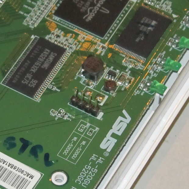 Justo a la izquierda del logo ASUS, verá cuatro vias rellenos en una fila de la soldadura. La soldadura de 4 pines a las vias. De izquierda a derecha tienes:
