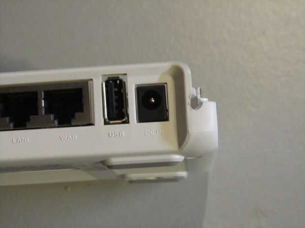 Después de los 4 pernos en su lugar, conecte dos cables, uno al pin GND (cable negro), uno al pin RX (un cable rojo). Hacer un pequeño agujero en la caja de plástico para los dos cables y ahora puede cerrar el router de respaldo. Atornillar los 4 tornillos de atrás y volver a colocar las patas de 2 goma.