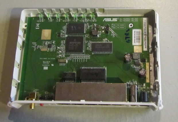 En la parte posterior del router encontrará 4 tornillos (dos de ellos están bajo las patas de goma). Desatornille los cuatro tornillos y abrir la caja de plástico. Se encuentra una placa de circuito que se ve como el de la imagen.