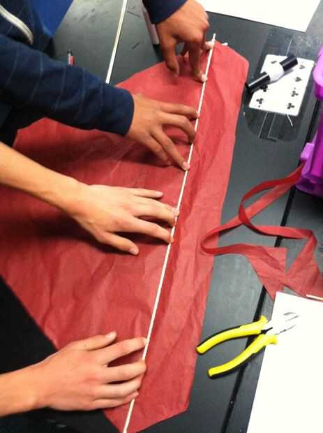 Coloque una línea de pegamento desde el centro (izquierda o derecha) hasta la esquina simétrica (izquierdo o derecho), esto debe ser la esquina media. Coloque el larguero 31,5" bambú en esta línea de pegamento. Presione spar pegamento durante 30 segundos a un minuto. Asegúrese de que hay aproximadamente 1" de bambú colgando fuera del borde del papel de la vela. Esto es importante para la reverencia cometa más adelante.