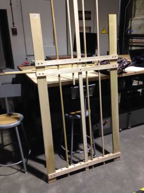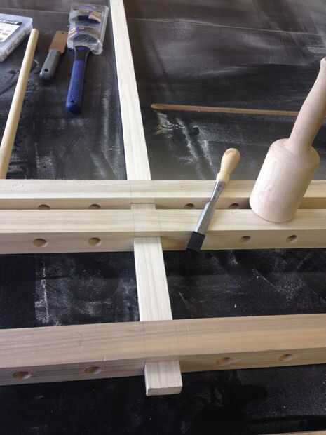 Ahora, deberás deslizar las rondas por los agujeros alineados en los travesaños. Necesita un mazo de goma para esto. No te preocupes demasiado acerca de dañar los extremos de los redondos con el mazo, como que va ser recorte les más adelante.