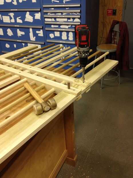 Así, en este punto, los agujeros de perno están a través de las Cruz-piezas únicas y no las piezas del marco. Hicimos esto para permitir un cierto margen de maniobra en nuestra carpintería. Ahora, tenemos que utilizar una broca de taladro hacer un agujero precisamente alineado a través de la pieza del marco. Después de cada agujero, necesitamos hacer una longitud de 0,50" pasador a través de. Esto hará que los muy fuertes. Puede corte los pasadores o les recorte la espiga como empujas a través. Si usted pre corta, asegúrese de dejar espacio extra para recortar al terminar.