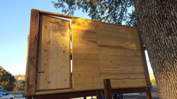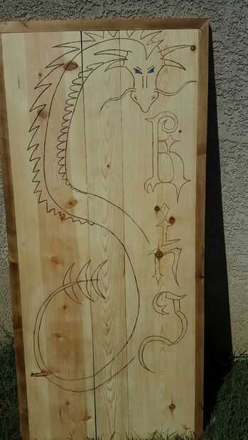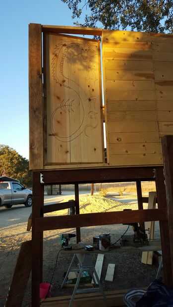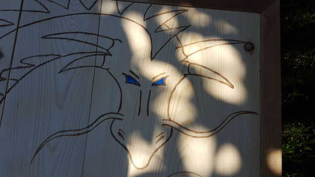 Hemos añadido algunos pintura azul a los ojos del dragón y terminado con un poli claro para preservarla. luego lo atamos a la casa del árbol con bisagras de cierre automático.