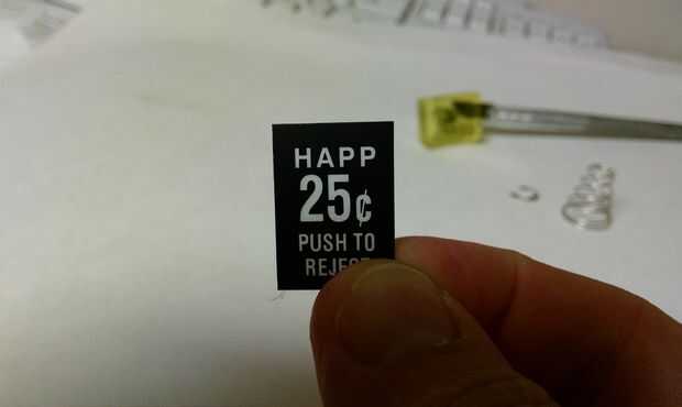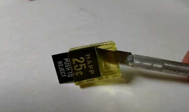 A continuación, tome el cuchillo X-ACTO o maquinilla de afeitar y empuje cuidadosamente el inserto del botón de la moneda. En mi caso hay ranuras en ambos lados del botón, con solo lo suficientemente grande como para empujar en la inserción de cada lado. Tenga en cuenta, su aplicación puede variar. Una vez que se quita el inserto, puede utilizar una referencia de tamaño al imprimir a sus nuevos casquillos.