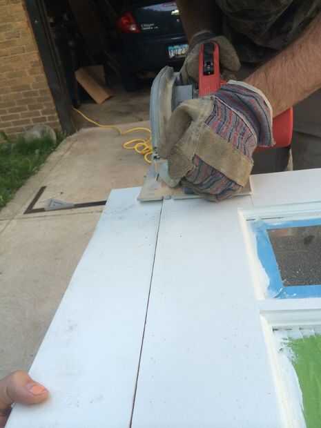 Nuestra puerta de establece algunos parámetros fácil en cuanto a tamaño. Medimos la parte inferior de la puerta para marcar un corte y hacer la puerta simétrica. Antes de cortar, nos preocupaba que la puerta era hueco y podría ser destruida por corte. Sopesando los pros y los contras que se determinó que no queremos una hueco puerta sentados sobre nosotros mientras dormimos (casualmente ignorando el vidrio, personas).