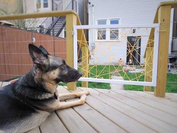 Usé un gran gancho y del ojo, super sencillo, a la puerta con la cerradura. Y ahora tenemos un perro tranquilo colgando en la terraza con nosotros, mantenerlo fuera de daños! Además de la puerta mira maldito fría. Así que ganar todo!