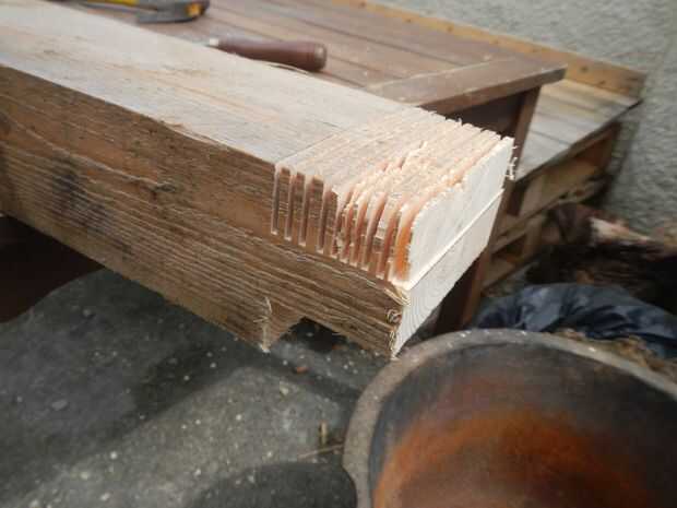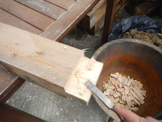 El riel superior fue cortado y un empalme de espiga se cortó cada extremo. Uso una sierra circular a la profundidad adecuada hacer un montón de cortes finos a lo largo de la madera a ser quitado. Esto hace picar mucho más fácil.