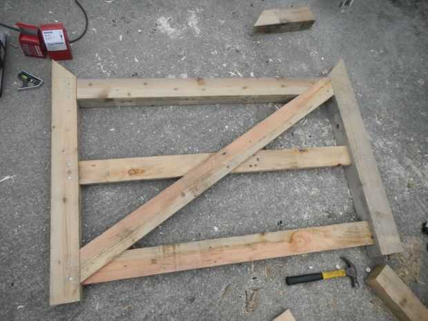 Diagonales, hecho de un listón de plataforma, caben desde la parte inferior del lado con bisagras en la parte superior del otro lado. Esto es para detener la puerta caída por su propio peso con el tiempo. Medir y cortar el listón y hacer los cortes de ángulos en cada extremo. Marque la barra superior donde es cruzado por la diagonal.