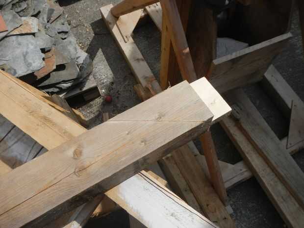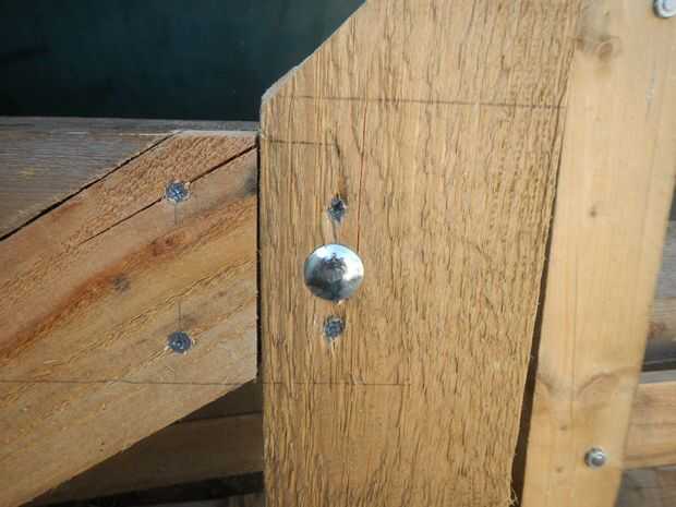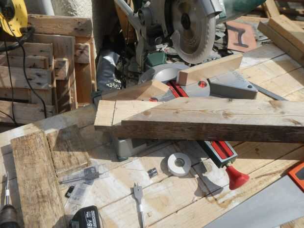 Corte el ángulo en la tapa de la barra (ajuste de la sierra a la profundidad del listón plataforma) eliminar el exceso de madera con un cincel para darle una buena ranura para el soporte. Se muestra a continuación la ortesis se ajusta en color. (sustituí este pedazo después de que el tornillo partido del final. Evitar más tarde por taladrar un agujero piloto)