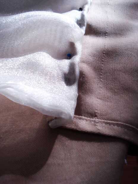 Ahora que el Valencia se une, doblar la tela de nylon sobre el borde de la tela tan para ocultar el borde y la clavija.