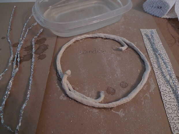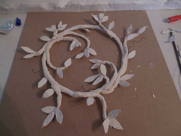 Pone contra su diseño, hacer 8 piezas, cortar y formar para hacer su forma, ahora los ponen hacia fuera rectas, corte tiras de tela de yeso 1 pulgada de ancho pero a la longitud de la vid, coloque la tira en el agua y tire hacia afuera, mientras sostiene en la mano, poner la vid en, doble más un lado de tela y luego el otro , giro y crema de yeso. (Hay instrucciones con yeso paño leerlos y por favor no descarga el agua en cualquier desagüe).