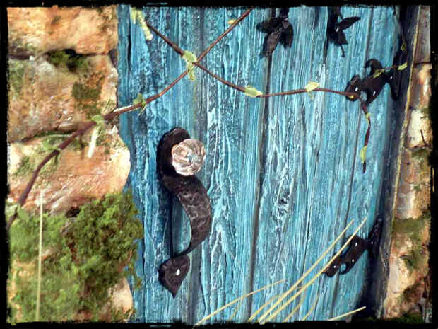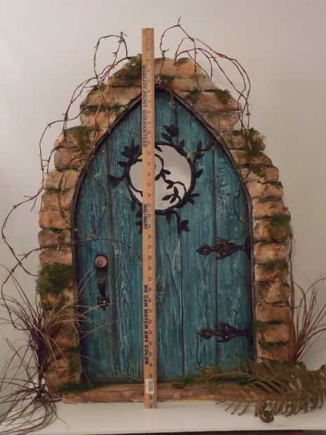 Embellecimiento tiene muchas capas, mediante la adición de viñas, pastos, flores gigantes; lo que sea, sólo añade a la ilusión. Si pueden imaginarse esta puerta que pertenece a un hada, entonces también puede imaginar elementos de ajuste, que ella o él pudo haber encontrado, que muestra la escala de las cosas, como un gigantesco carrete de hilo, tal vez la ventana se hace con un vidrio de reloj, un pendiente de la manija de la puerta, usted consigue el cuadro. Al crear cualquier puerta de fantasía, es el entorno que cumplir con la fantasía, crea un puente de la realidad y hace una puerta de entrada a un lugar mágico.