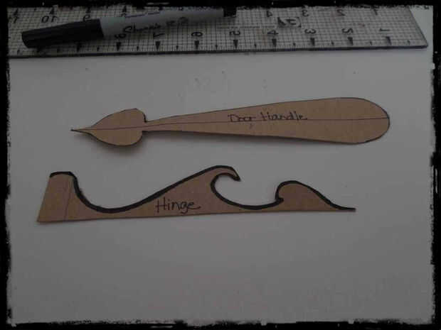 Diseñé una bisagra simple y la manija, la tapa de la viuda es que sólo un círculo de vid con hojas. Usted puede encontrar un montón de imágenes prediseñadas para el trabajo del hierro de lujo si quieres.