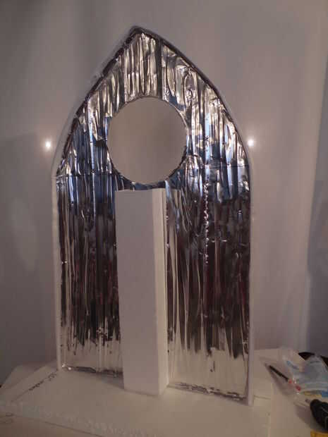 Pegamento caliente del borde de 1/2 pulgada de tela, en la parte inferior de la puerta, en el umbral, coloque un bloque de espuma en la parte posterior de la puerta debajo de la abertura de ventana, pegamento en su lugar, esto es más apoyo y una manija para llevar a escena este será un apoyo para el estudio de la foto.
