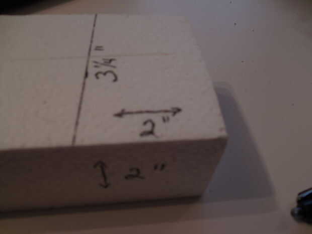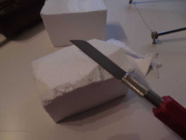 Mis piedras eran 3" a través de porque utilicé scrap espuma otra vez, piedras podían ser más grandes, y todavía se vería bien en este proyecto. Fue cortado el bloque grande 3 "x 2" x 2 "y 28 piezas, algunas de bruja se cortaron más pequeños para darle un mejor aspecto, luego se corta algunos pedazos más largos de la curva en la parte superior, hasta alrededor de 4" de largo. Tomar los bloques pequeños y cuchillo de corte y ajuste de borde duro; cuchillo caliente del alambre se puede utilizar. Hacer cortes profundos en algunos, incluso un par de pequeños agujeros. Guardar los bloques más grandes para más adelante.