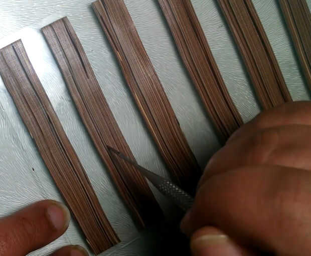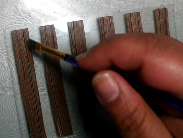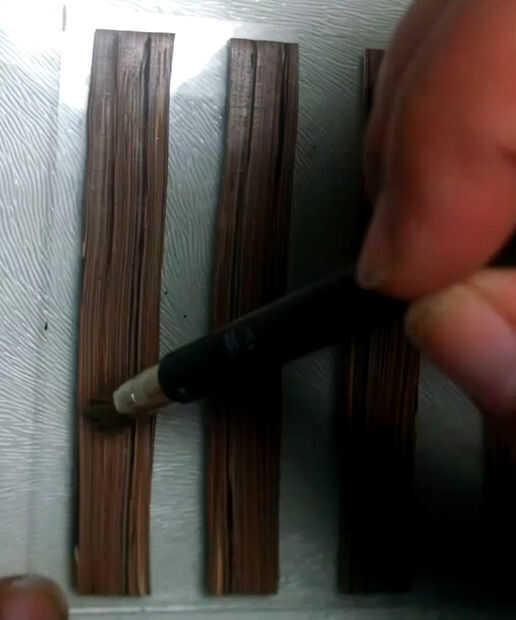 Rebanada fina tiras de "madera" y el diseño para texturizar y colorear. Utilizando una herramienta de la aguja, un palillo o la punta de su cuchillo del exacto, tallar unas líneas. No recto. Me gusta elegir las líneas a seguir en la caña. No ir a través de todo el camino. La cantidad y la profundidad y ancho depende cómo resistido de look va. También me gusta cepillar ligeramente sobre él con un cepillo de alambre. El más ligero se hace, más como la madera lijada. El más profundo y más se resistió. Si no tienes un cepillo de alambre, trabaja un pincel de cerdas duras. También lo hace ir una y otra vez como un loco con un palillo o aguja herramienta.