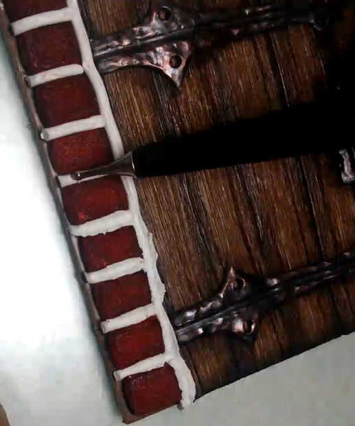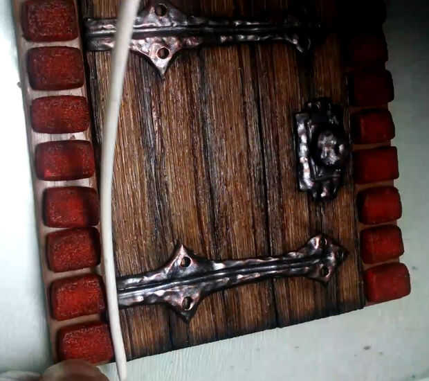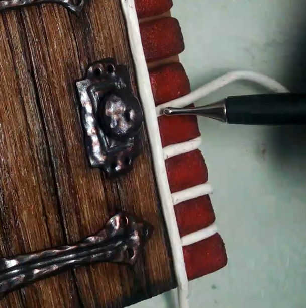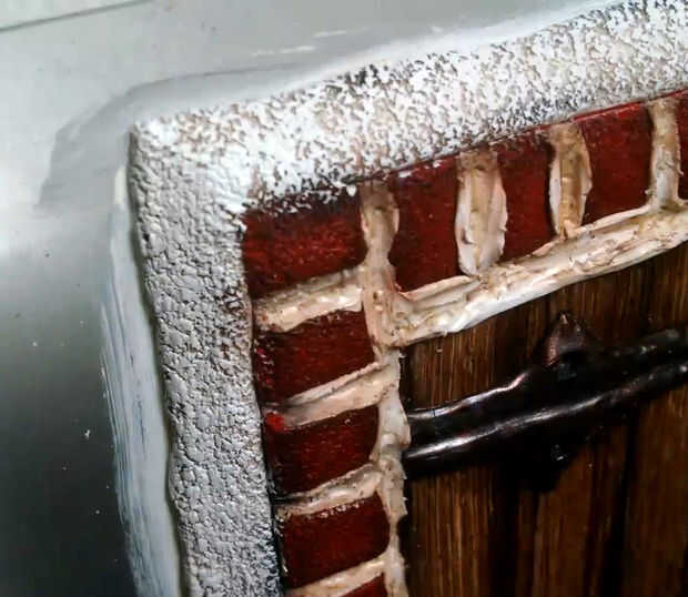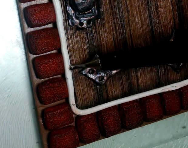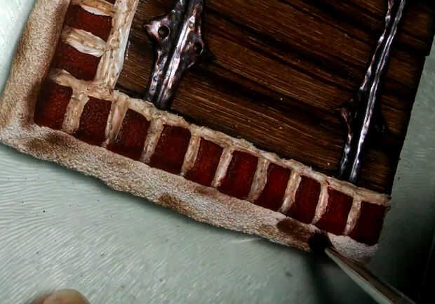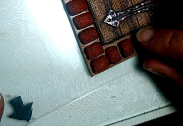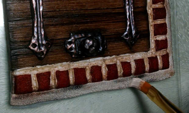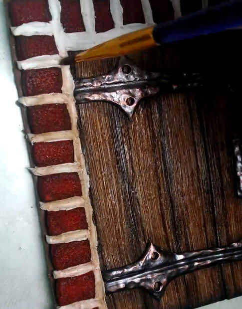 Con algo de blanco, estirar una cuerda delgada entre cada uno. Pone entre cada ladrillo y alrededor de la puerta. Con la herramienta de la bola más pequeña, presione la cuerda entre los ladrillos, hacer un surco descuidado. Con algunos gris claro o marrón claro agregue un cierto color pastel. Recortar los bordes de los ladrillos y luego la cortina con un negro.