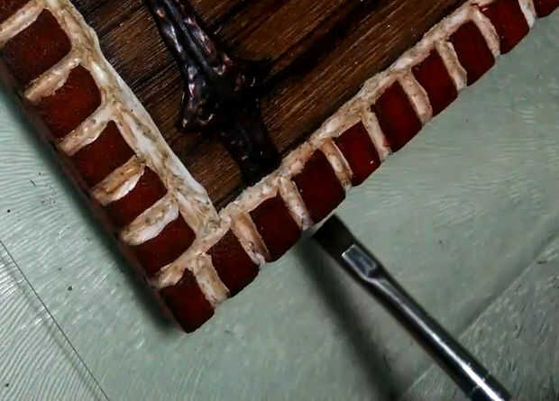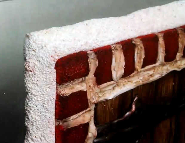 Para la pared, toma una cuerda más gruesa de blanco alrededor de los bordes y presione en. Con el cepillo de alambre, agresivamente Pulse la cuerda, empujando hacia el lado y una inclinación en los bordes. Entonces la cortina con marrones y negros, tal vez incluso verdes con algunos pasteles. Entonces seco cepillo algo de blanco en la parte superior. El pastel sólo se ojeada a través de aquí y de allá y los agujeros del cepillo que alisar un poco a ser un muro de aspecto agradable.