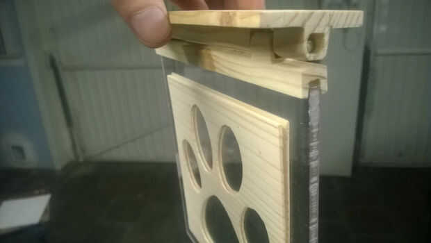 - Con la Sierra de cinta, corte una pieza de 16 x 16.3 cm de acrílico, que se convertirá en la aleta real de nuestra puerta (segunda foto). Como alternativa... Nunca he probado esto, pero también debe trabajar con una sierra para metales.