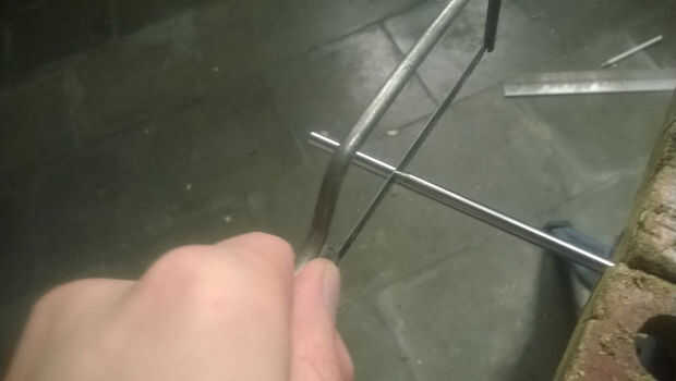 - Todavía necesitamos algo que conecte la parte superior e inferior partes de la bisagra. Utiliza una sierra para metales para cortar dos 5 cilindros de cm de largo de una barra de metal que podrido de un viejo escáner (quinta foto). Puede que necesite limpiar los cortes con algunos archivos o papel de lija.