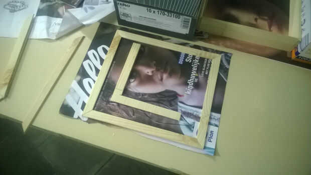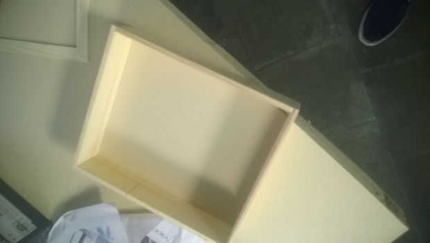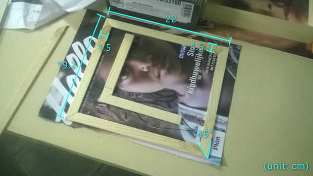 - Usando pegamento de madera, coloque las piezas para hacer dos 22 x 19,2 cm foto marcos (cuadro VIII). Asegúrese de comprobar que las esquinas son cuadradas mientras que el pegamento se seca. También he añadido algunos pesos en la parte superior las esquinas para tener un poco de fuerza de sujeción.