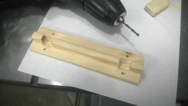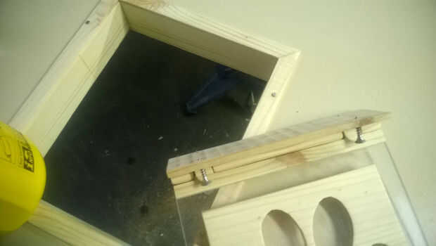 - Conducir un tornillo en cada orificio piloto, por lo que la punta de cada tornillo se asoma hacia fuera en el otro lado de la bisagra superior parte (tercera imagen).