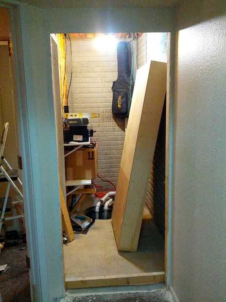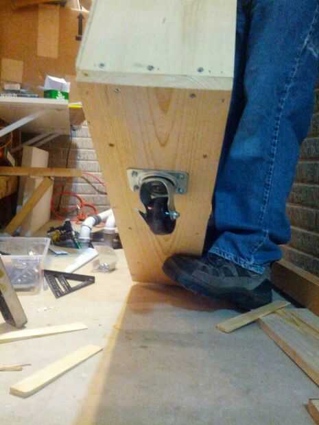 La apertura para mi caso DVD ya fue cortada usando mis medidas de sketchup. Para ayudar en la manipulación en el lugar, clavó un pedazo de madera la altura exacta de mi rueda. Esto me permitió identificar un problema potencial en ataque. Porque mis paredes no ciruelas, tuve que hacer unos ajustes y afeitarse abajo de la estructura de postes.