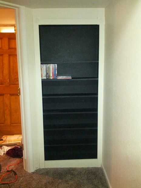 Por último, pintar o manchar su DVD caso y ajuste. Utiliza una pintura negra mate para hacer el DVD destaca, pero iba con un satén o cáscara de huevo en el futuro. Cuando ase los estantes para cerrar la puerta, el acabado plano deja una leve impresión de que tengo que limpiar para que se vea buena