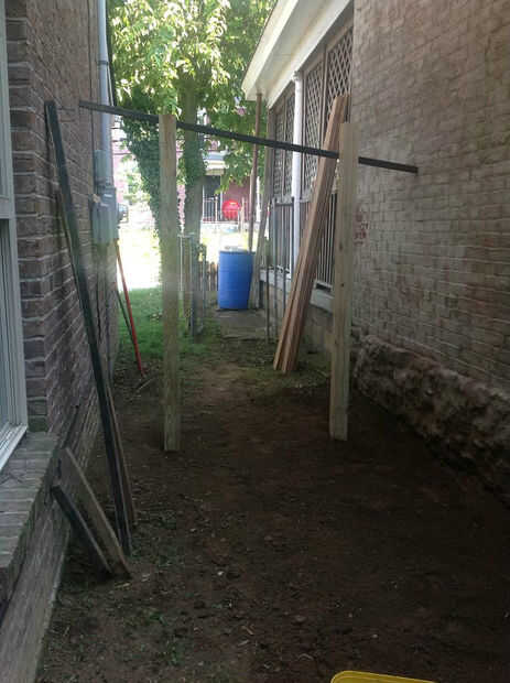 Por lo tanto, tendrás que ver configuración entradas en concreto ya no grabo esa parte. Eso es bastante cosas estándar, pero por si acaso pregunto me puse mina en 24" agujeros fueron alrededor de 18" de diámetro. Los postes son 8' tratados 4 x 4 sistema 24" en el suelo son 6' altos. Esto se basa en el código para hormigón vertido (18" por debajo de la línea de escarcha que es 6" por debajo de la superficie) y línea de escarcha en Lexington KY. La izquierda es 18.5" desde mi casa (casa gris) y el poste derecho es 60.5 desde mi casa, estas medidas muy probablemente cambiará para su proyecto, solo les estoy dando para la referencia. Creo que he usado un par de bolsas de 80 lb para verter los dos agujeros, he dejado cerca de cuatro pulgadas en la parte superior del orificio superior se llenan de suciedad, este tal vez es mala idea para logevity de los puestos. Por supuesto mantener los puestos en su lugar con estacas y los apoyos y que la curación por varios días, etc.. Había planeado sobre la instalación de una puerta así que puse dos puestos uno para el otro para el lado de cierre lateral de la bisagra.