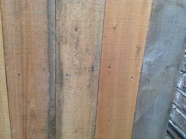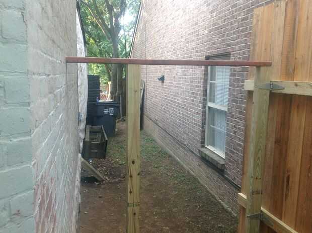 Añadir que las barras de la primeras y la últimas (extrema izquierdas y extrema derecha) utilizan sólo un tornillo en el centro de puntos de enganche. Ahora usted debe ser capaz de ajustar los rieles. Obviamente usted necesita medir y asegúrese que los rieles estén paralelos y rectos. Ahora empezar a llenar en el lado de un medio a otro, me fui derecha a izquierda. Debe escalonar los tornillos en forma de "v" para aumentar la rigidez (ver foto) a medida que agrega barras notará la puerta cada vez más rígido. Por el último piquete la puerta debe ser recto y no caídos. Cuando me funcionó terminé genial, excepto cuando hace pivotar hacia fuera la puerta quisiera tocar el suelo y noté que el poste derecho fue doblado por el peso de la puerta que se extiende hacia afuera. Eso es cuando agregué la parte superior "estabilizador" de la barra (segunda foto), se trata de esstential al diseño. Mina se enrosca en la parte superior de la derecha e izquierda puestos y luego botas hasta mi casa. Necesito agregar una escuadra para anclar a mi casa para mantener los postes se balancee hacia afuera cuando la puerta se abre, aunque eso no parece interferir con la función de puertas