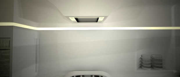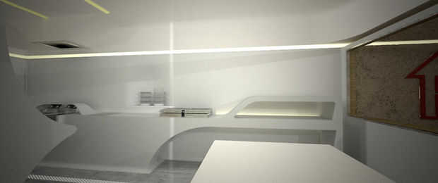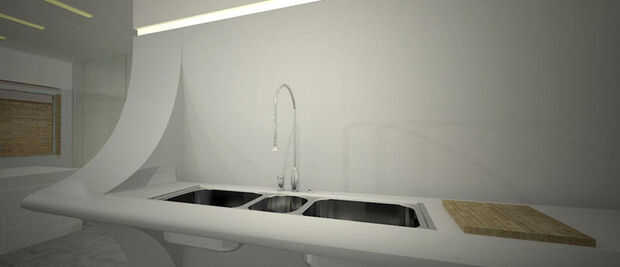 la cocina es también libres de suciedad. Se lava en la noche automáticamente, es prácticamente una vaina sellada, sobre todo en epoxy. por eso todo se curva para que el agua que sale del techo, con rociadores ocultos es regado con gravedad y está agotado en el centro. recursos muy limitados para limpiar todo. ninguna otra cocina del mundo puede ser este "sanitized".